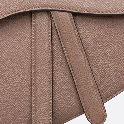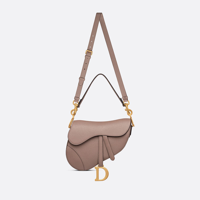 Maria Grazia Chiuri brings a fresh update to the iconic Saddle bag. Crafted in warm taupe grained calfskin, the legendary design features a Saddle flap with a D stirrup clasp on a magnetic strap, as well as an antique gold-finish metal CD signature on either side of the strap. Equipped with a thin, adjustable and removable shoulder strap, the Saddle bag may be carried by hand, worn over the shoulder or crossbody.