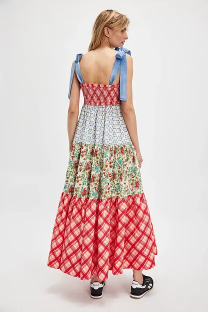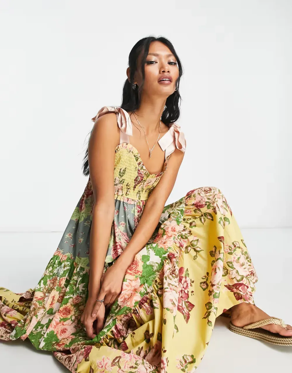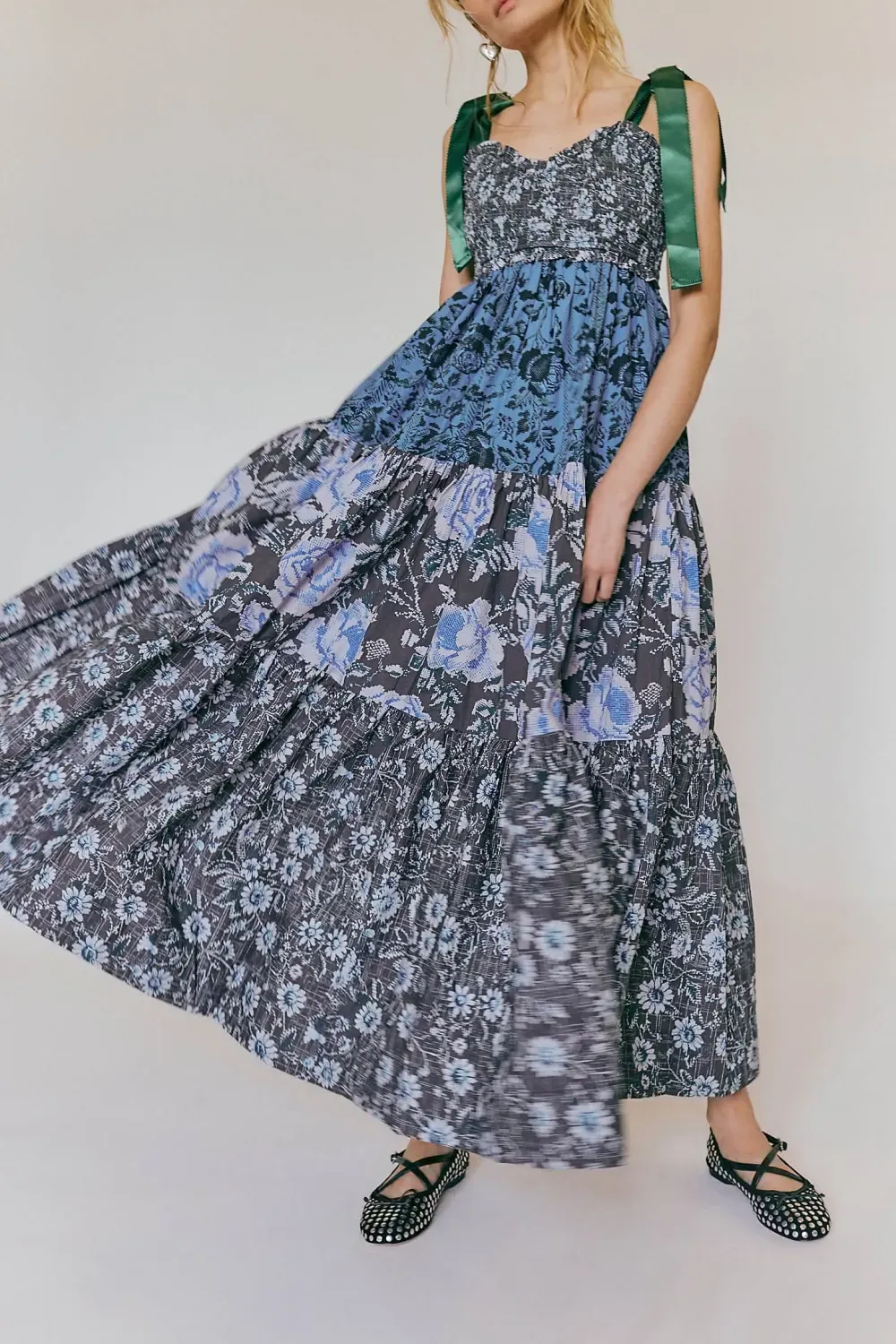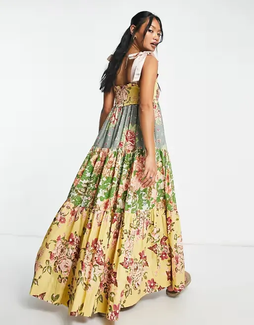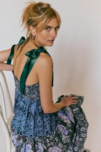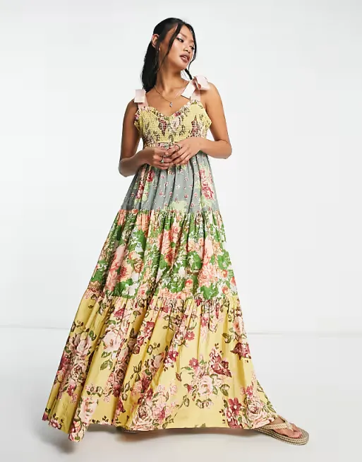 Printed to perfection in a forever femme floral print, this stunning maxi dress features a smocked bust with tiered bottom skirt and exaggerated shoulder ties for an added sweet touch.