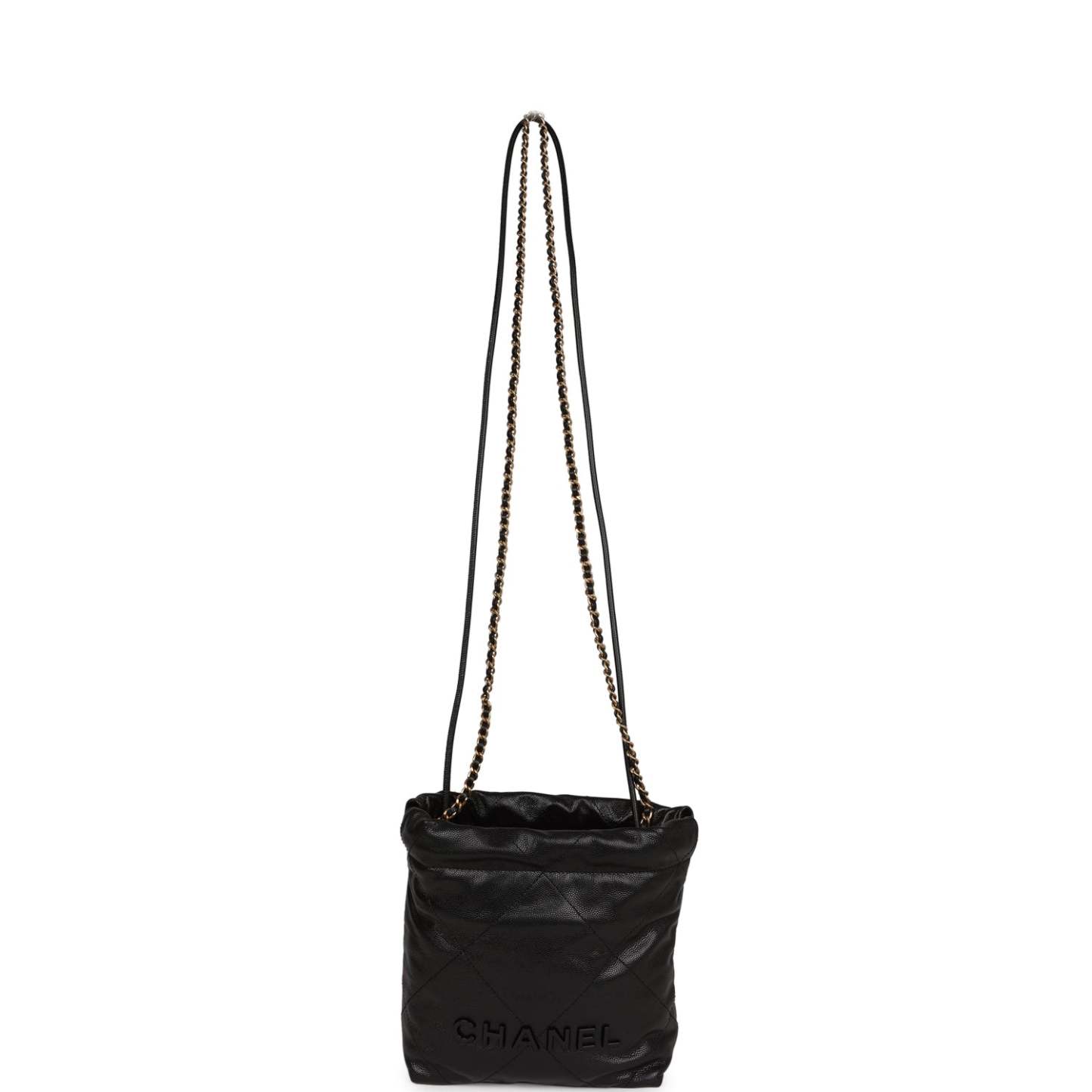 This Mini 22 Hobo Bag is in black caviar with gold tone hardware, Chatktnel on the front in black tone metal, a short gold tone and leather interwoven chain, a long one, and a long leather cord strap.
