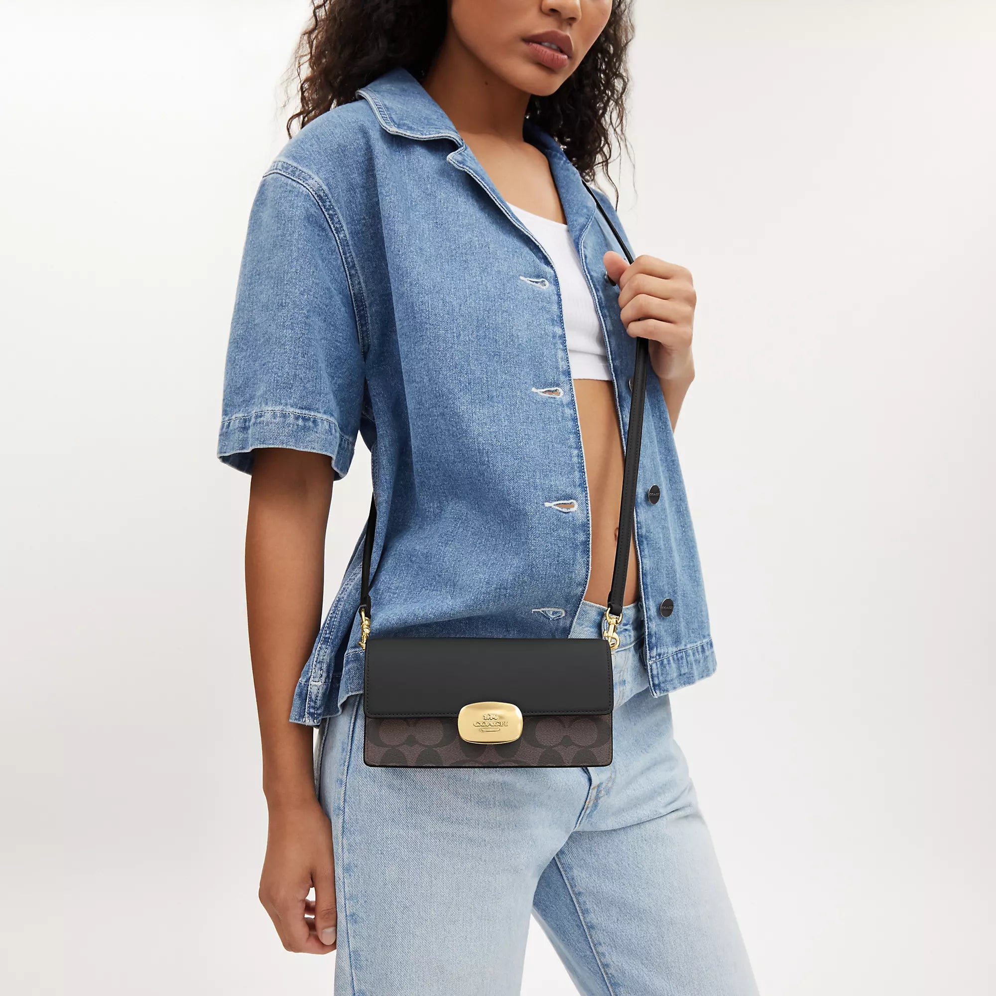 Signature coated canvas and smooth leather Inside multifunction pocket Snap closure fabric lining Outside open pocket Detachable strap with 23 drop for shoulder or crossbody wear 7 1/2 (L) x 4 (H) x 1 1/2 (W) Style No. CP044 | COTKTACH Outlet Eliza Small Flap Crossbody In Signature Canvas - Brown