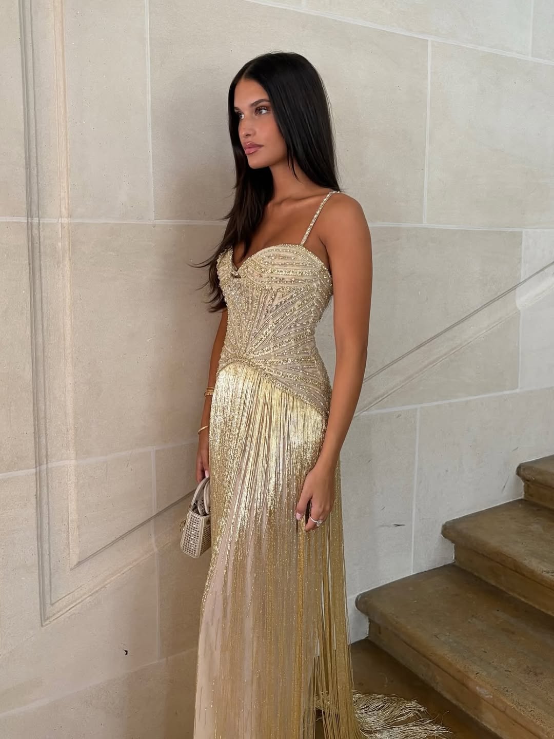 designed to flatter, shine, and move beautifully with you.Featuring a classic sweetheart neckline, delicate rhinestone accents, and a soft champagne tone, this dress is made for unforgettable nights — from prom to formal events.